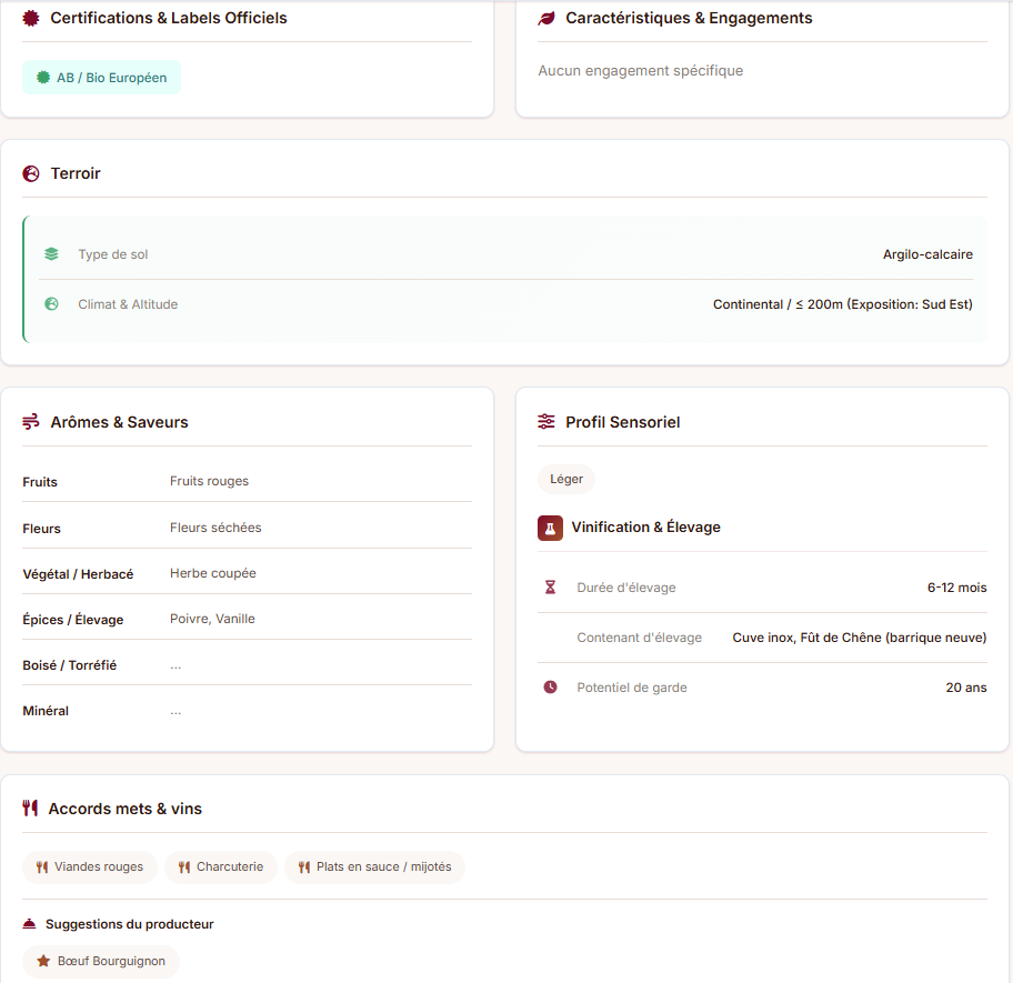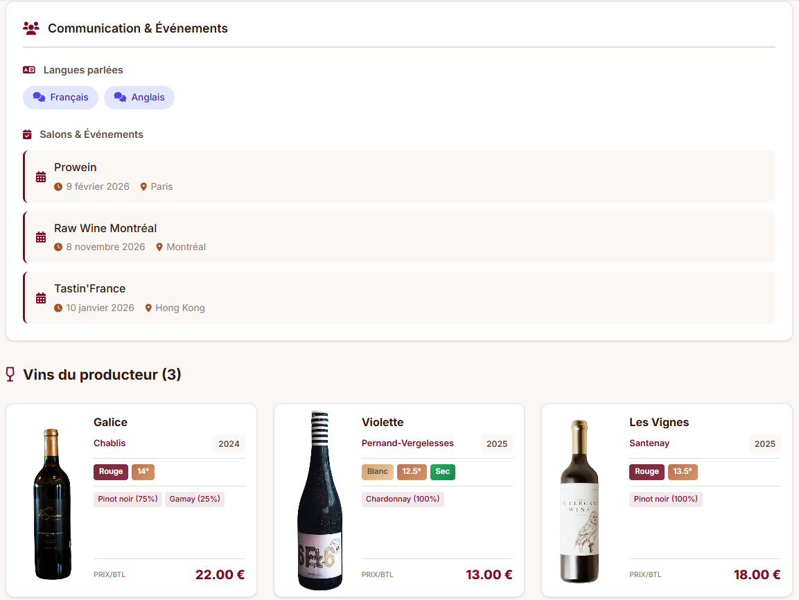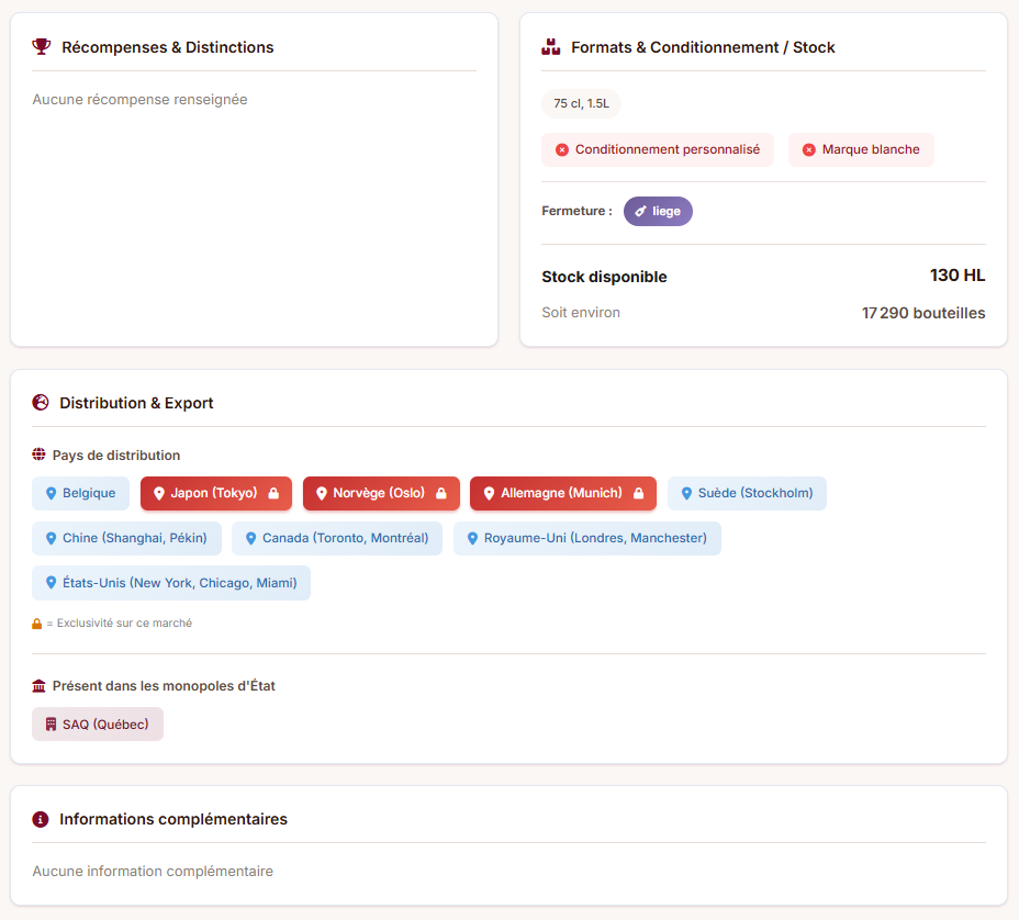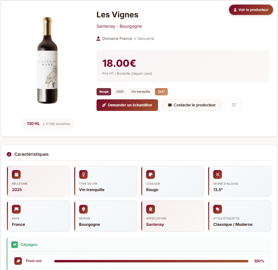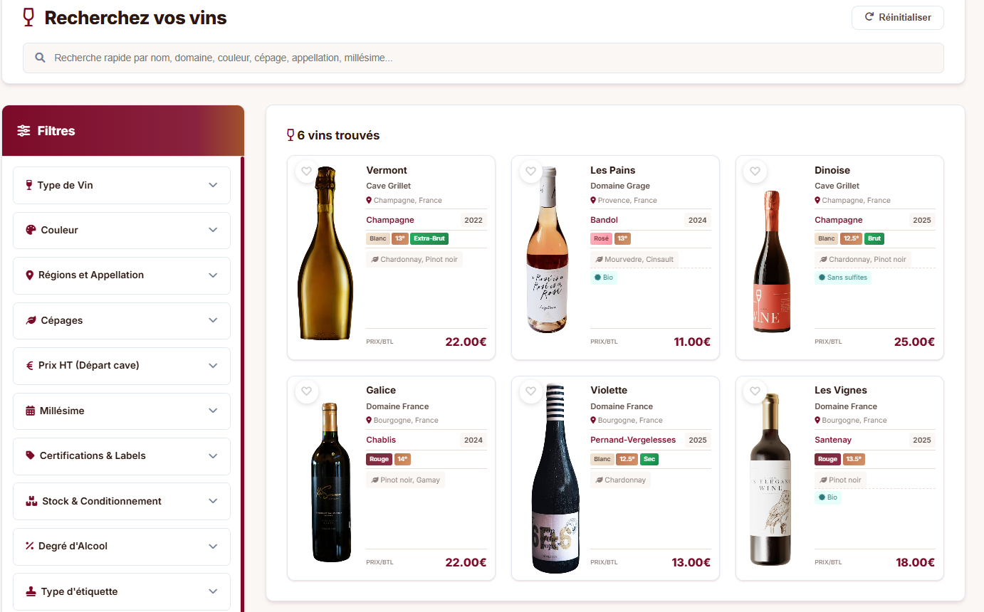 Des filtres B2B avancés pour identifier rapidement les vins adaptés à vos attentes, avec toutes les informations essentielles accessibles instantanément.