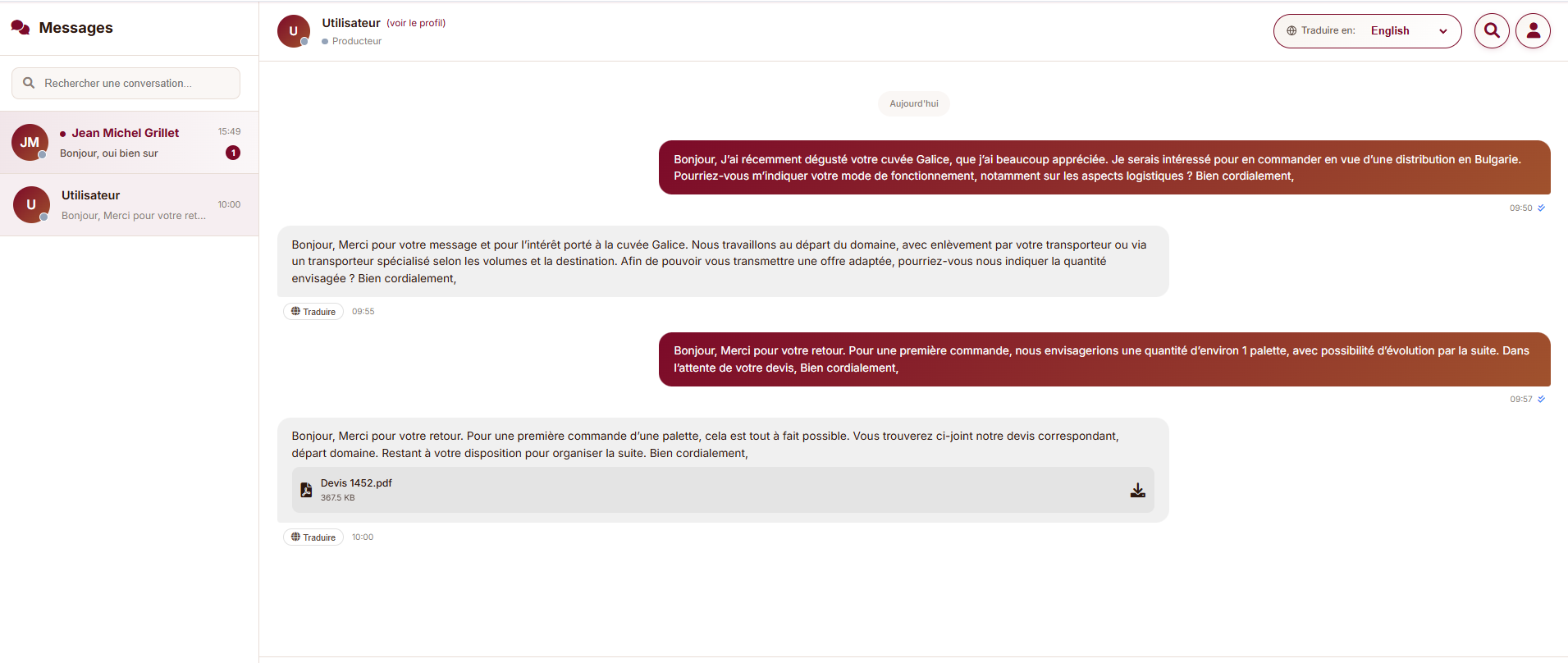 Contactez directement les producteurs via une messagerie centralisée avec traduction automatique. Votre profil reste visible uniquement lorsque vous initiez la discussion.